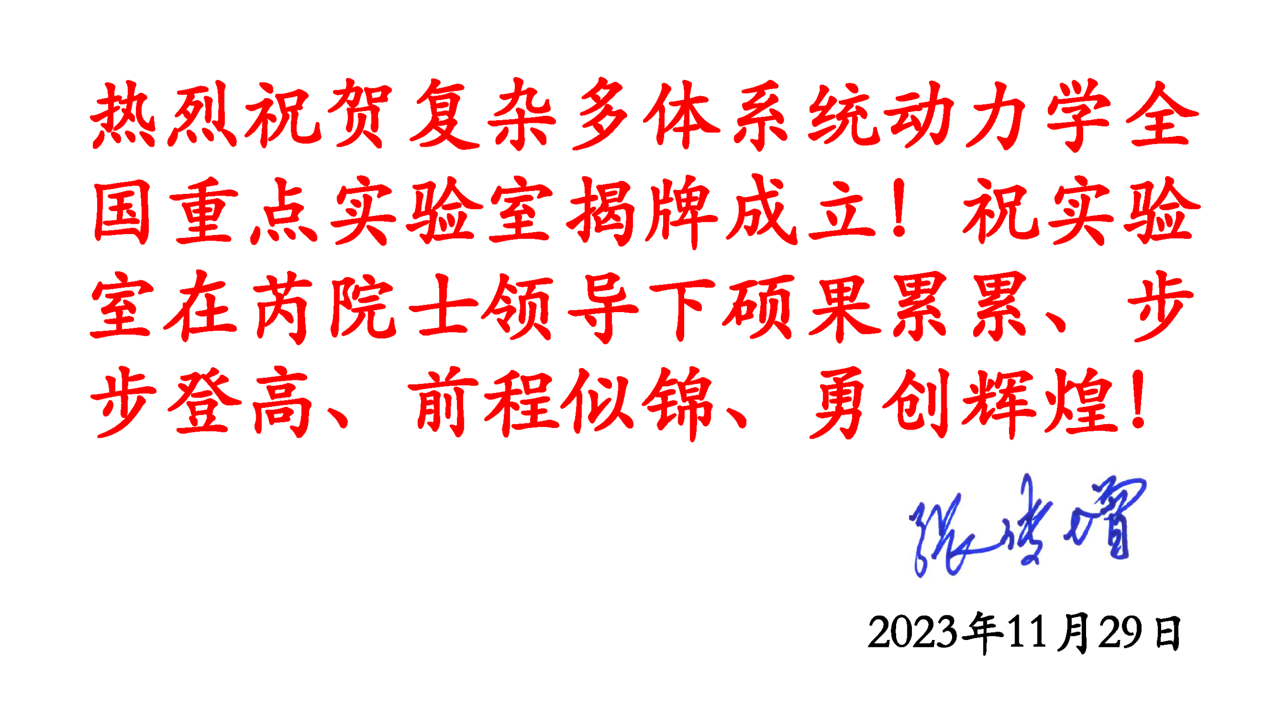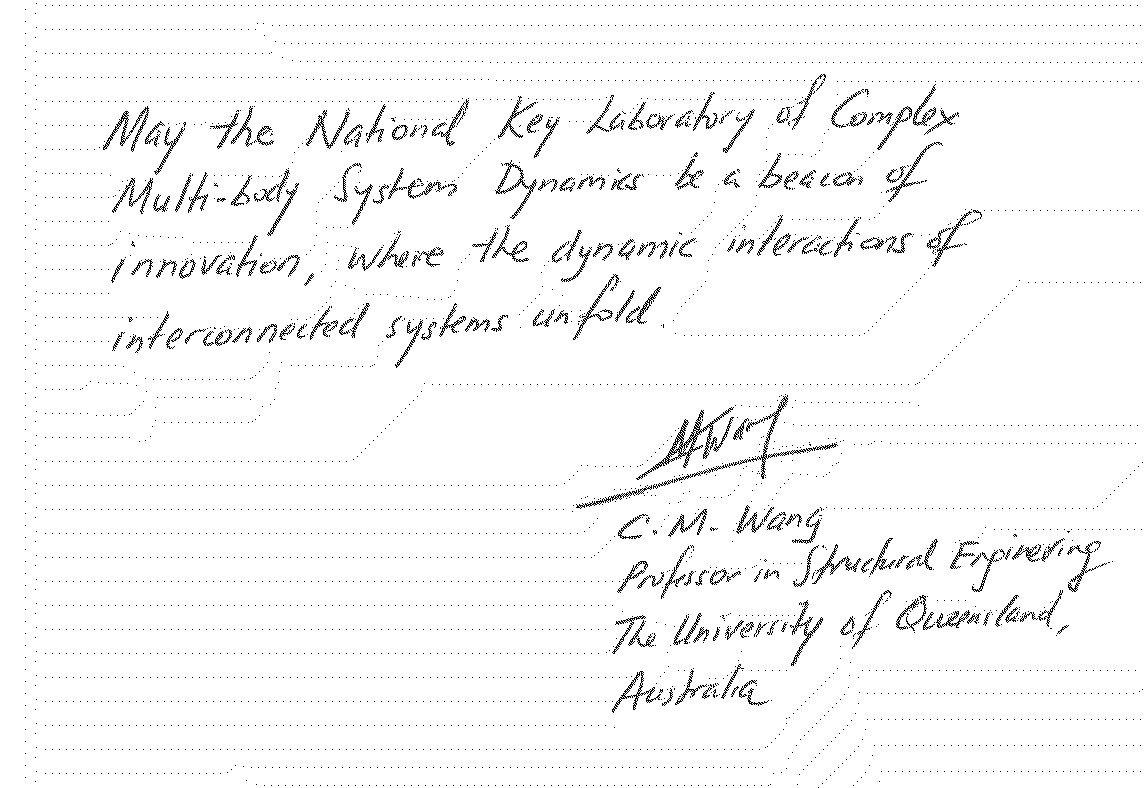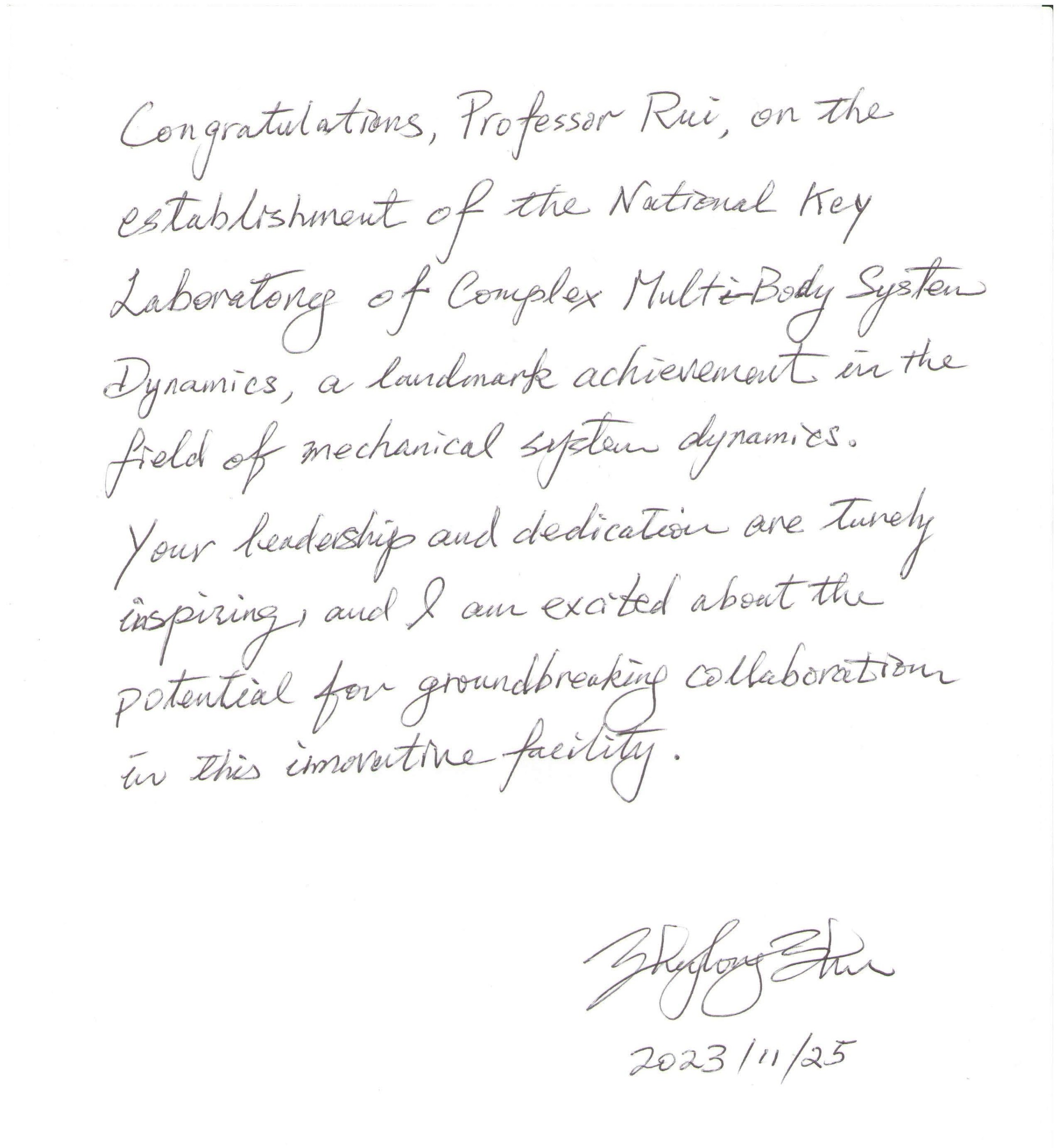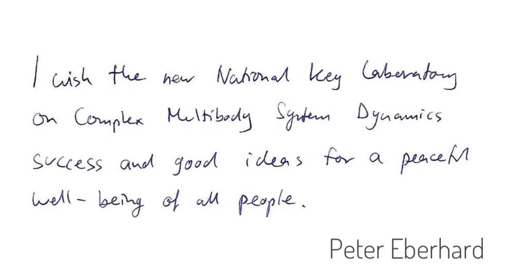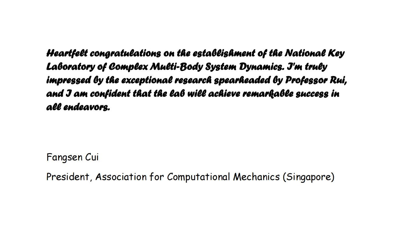 Nearly forty esteemed scientists extended their heartfelt congratulations on the founding of the National Key Laboratory of Complex Multibody System Dynamics. Many thanks for their strong support! We would also like to express our sincere gratitude to everyone who contributed to the establishment of the Key Laboratory.