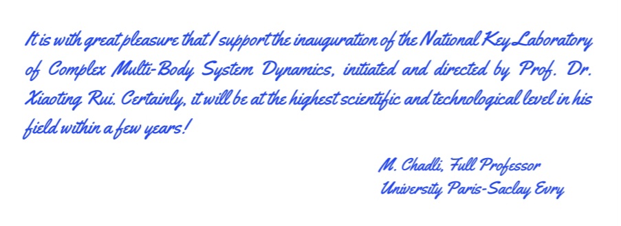 National Key Laboratory of Complex Multibody System Dynamics, based on the launch dynamics research group established by Prof. Xiaoting Rui, Member of the National Academy of Sciences and President of the International Society of Mechanical System Dynamics (ISMSD) since 1986, has been continuously developed for more than 30 years, including the establishment of Institute of Launch Dynamics and Key Laboratory of Ministry of Industry and Information Technology for Complex Equipment System Dynamics. It was officially approved by the government for establishment in January 2023. The National Key Laboratory of Complex Multibody System Dynamics is the supporting / affiliated organization and leader, editor-in-chief, and chairman organization of three national platforms and three international organizations. The national platforms are the Professional Group of Commission Equipment, the Frontier Science Center for System Dynamics of Complex Equipment, and the China Society of Launch Dynamics (preparatory); and the three international organizations are the International Society of Mechanical System Dynamics, the International Journal of Mechanical System Dynamics, and the Standing International Conference on Mechanical System Dynamics.